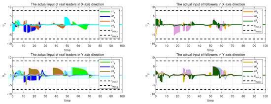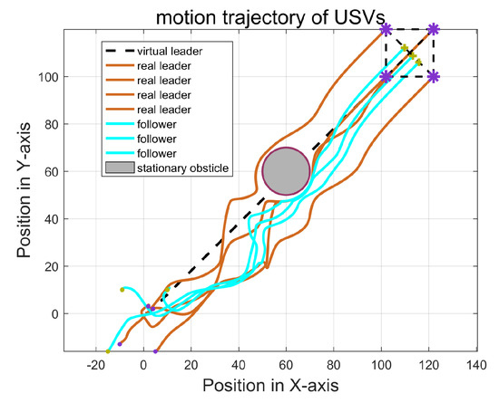 The trajectories of USVs in the distributed cooperative layer obtained by the multi-USV system driven by controller (33) are shown in Figure 4. The system can be driven by the control strategy to perform the formation-containment tracking control task: real leaders can form the expected formations; followers can converge into the convex hull; the motion of the whole system is controlled by the virtual leader. At the same time, all USVs can avoid obstacles. The smooth trajectories of the agents represent no significant abrupt changes in the state of the USVs.