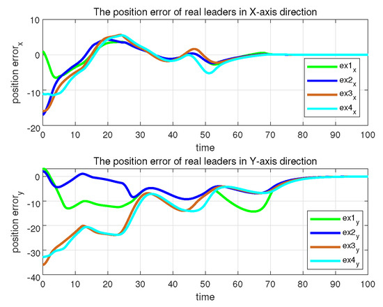 where we use the fact that . If is equal to 0, then is equal to 0. If not, then , which means that is equal to 0 in a finite time. Since , it leads to and as . And the system has completed the formation tracking task in a finite time. Then, it will be demonstrated that containment control can be achieved. For the real leaders, it follows that , where , which requires that . For the followers, we let