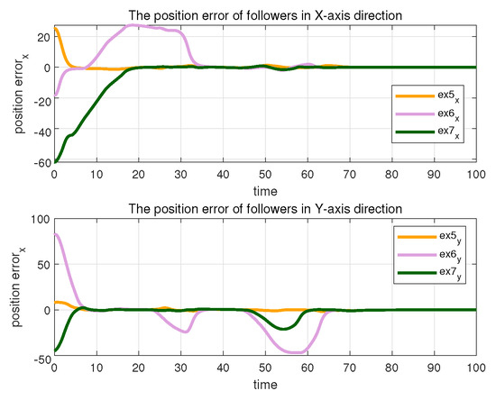 The errors in formation-tracking control and containment control can be seen in Figure 5, Figure 6, Figure 7 and Figure 8. Figure 5 and Figure 6 show the formation-tracking position errors and velocity errors of the real leaders. The errors arise from the need for real leaders to track virtual leader states and form time-invariant formations, as shown in Equation (9). Figure 7 and Figure 8 show the containment position errors and velocity errors of the followers. The errors arise from the need for followers to track the states of the real leaders, as shown in Equation (16). The asymptotic convergence of all errors to zero indicates that the system is finally stable and completes the formation-containment tracking control task. The oscillations in these figures are produced by avoiding obstacles and other USVs. It is worth noticing that the convergence of the followers occurs after the convergence of the real leaders, but the time interval can be ignored in the application of the algorithm.