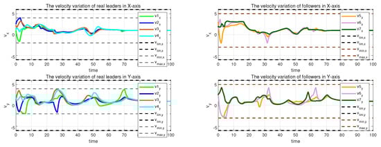 The accelerations and velocities of each USV are limited to the required range, as shown in Figure 8 and Figure 9, where dashed lines indicate acceleration and velocity limits. Although the controller input oscillates during obstacle avoidance, the velocities and accelerations of all USVs eventually converge to the same level. The oscillations are caused by the controller solving a quadratic programming problem during obstacle avoidance, the solution of which leads to abrupt changes in the controller inputs. Even during the obstacle avoidance process, the velocities and accelerations of all the USVs do not exceed the required limits.