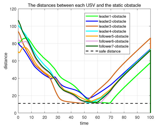 To illustrate more clearly that in this example, the USVs can avoid obstacles, the distance between each USV and the center of the obstacle is plotted, as shown in Figure 10, where the dashed lines represent the safe distance. We further illustrate the effectiveness of obstacle avoidance by adding a time axis, zooming in on the local trajectory figure, and increasing the safety distance incrementally, as shown in Figure 11. The figure shows that the trajectory of each USV is smooth when avoiding obstacles and confirms that the velocities and inputs of each USV are limited. With the increase in safety distance, the implementation of the algorithm is still effective. Therefore, in practice, the setting of safety distance can be adjusted appropriately for better security.