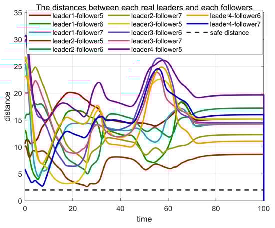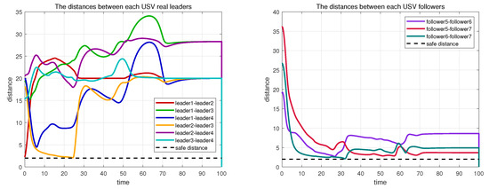 Due to the different limited accelerations and velocities of the followers and leaders, the distance between the USVs is plotted to illustrate the collision avoidance effectiveness of the USVs, as shown in Figure 12 and Figure 13, with the dotted line representing the safe distance. In this example, the initial position of the real leader is set farther away from the follower, and the likelihood of collisions occurring is reduced. However, the whole system still realizes collision avoidance with the USVs avoiding obstacles.