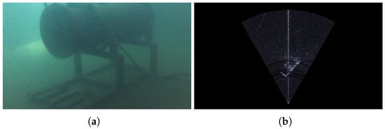 Visual methods are commonly used for land-based applications. Most of the research in underwater environments has focused on restoration, reconstruction, and color correction. Recognition, depth, and shape recovery are also important but less researched areas, with limited datasets providing ground truth, depth information, and labeled data []. Stereo vision is an essential technology for many computer vision systems that require depth information. There are several commonly used algorithms for feature detection and matching in computer vision, such as the Semi-Global Block Matching (SGBM) algorithm and others like SGM [], ORB [], SIFT [], etc. Among them, SGBM has been widely used for stereo matching tasks such as object detection, tracking, and scene reconstruction, but imaging conditions in underwater environments are challenging due to scattering, attenuation, limited visibility, and low light conditions, making it difficult to obtain accurate 3D maps of underwater objects []. Meanwhile, image acquisition by underwater platforms and divers can also introduce motion artifacts, blurring, and jitter, further degrading the image quality. As another commonly used underwater ranging device, image sonar is relatively robust and can be used regardless of water quality and lighting conditions. However, as shown in Figure 1, its resolution is low, and its imaging quality is often coarse, making it unsuitable for tasks that require color-related information, such as underwater pipeline corrosion measurement [].