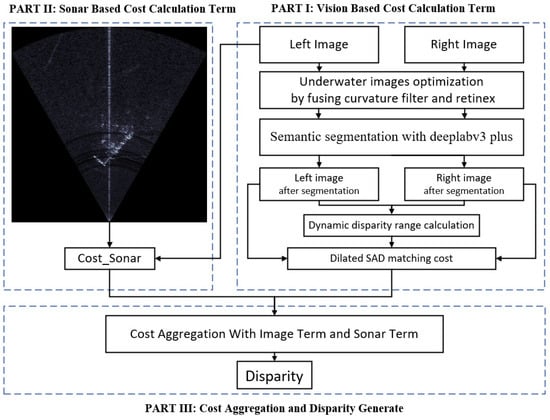 Framework of the proposed method. This framework shows a multi-stage approach to underwater stereo matching with a stereo camera and image sonar, starting with PART I: Vision-Based Cost Calculation utilizing stereo image optimization and semantic segmentation. PART II: Sonar-Based Cost Calculation, where sonar imagery informs cost metrics. PART III: Aggregation of costs from both visual and sonar data to compute disparity, illustrating the synergy between acoustic and optical sensing modalities for enhanced underwater perception.