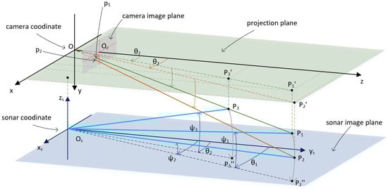 Multi-beam image sonar is an acoustic sensor that emits multiple beams of sound waves and measures the time delay and intensity of the reflected echoes to generate an image of the scene. Compared to optical sensors, sonar is relatively robust and can be used regardless of water quality and lighting conditions. In order to fuse information from both sonar and camera sensors, optical–acoustic epipolar geometry is a critical step. In the context of the combined binocular and sonar coordinate system, a point p that is visible in both the camera and sonar coordinate systems can be mathematically represented as: