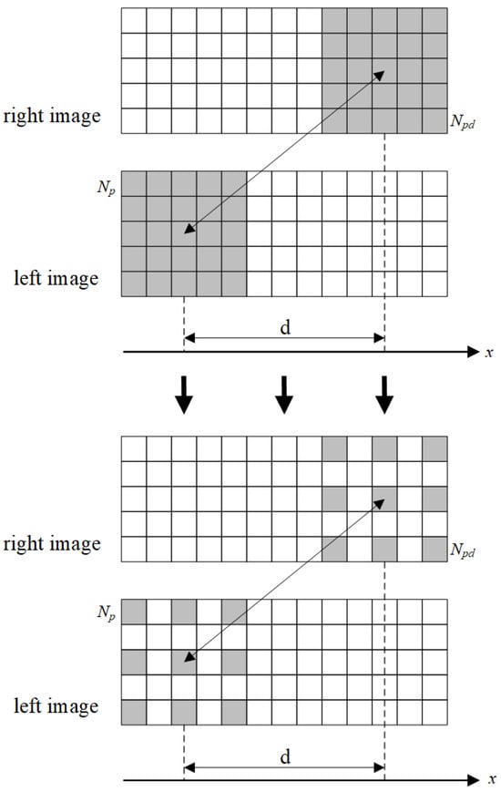 The purpose of matching cost calculation is to quantify the correlation between the pixel under consideration and the candidate pixel. Regardless of whether two pixels are corresponding points, their matching cost can be calculated using a matching cost function. A smaller cost indicates a higher degree of correlation, implying a greater probability of being corresponding points. The BT-SAD cost refers to the matching cost calculation in the SGBM algorithm. As shown in Figure 4, the scale of the cost volume is reduced. To improve the robustness of the BT-SAD cost under textureless conditions, we introduced an enhanced iteration of the BT-SAD algorithm, which incorporates a dilated SAD window tailored to the specific requirements of underwater measurement and image matching (see Figure 5). Before searching for corresponding pixels, it is common to specify a disparity search range for each pixel, limiting the range to within d, and the disparity d is treated as a fixed range, . However, a fixed range may not meet the requirements for all issues. To address this, we propose the disparity arrays of and , which are generated based on the object’s outline present in the mask image. In row i, the disparity pair , is illustrated as follows: