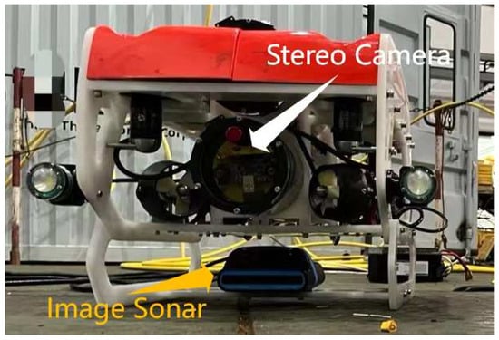 To conduct the experiments, we deployed an underwater robotic system featuring an 8-thruster remotely operated vehicle (ROV) outfitted with a stereo camera and a multi-beam sonar, as illustrated in Figure 7. This carefully engineered setup provided a high degree of realism, closely mimicking the operational environment of an actual underwater robot. The system was built on the robust Robot Operating System (ROS) platform. In this setup, the ROV functioned as the host, while the upper computer acted as the slave, facilitating efficient communication and control. The upper computer was equipped with an NVIDIA Jetson Xavier (Nvidia, Santa Clara, CA, USA), a powerful processor adept at handling intensive tasks such as stereo matching and various image processing activities. This processing capacity was crucial for the successful execution of the algorithm’s complex calculations, ensuring precise and real-time data processing. Additionally, the system was enhanced with an NVIDIA TX2 on the lower computer, which acted as the center for data collection and robot control. This setup allowed for effective data gathering and real-time management of the robot’s functions. This comprehensive arrangement ensured that the experiments were conducted in conditions that closely resembled real-world scenarios, thereby increasing the validity and applicability of the experimental results.