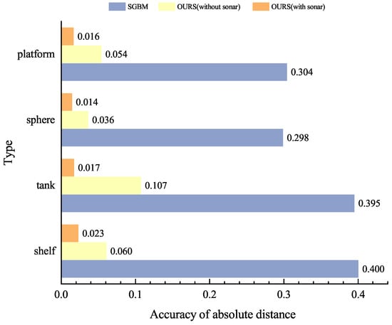 Furthermore, an in-depth analysis of the results presented in Figure 9 and Figure 10 reveals a notable trend. Specifically, it is evident that the closed-form target objects such as sphere, tank, and platform exhibit significantly improved accuracy when compared to the frame-like structure of the shelf target. Referencing Figure 8a, a fascinating observation can be made regarding the acoustic sonar data, particularly from the profile-like imaging perspective it offers. The measurement process appears to benefit substantially from the inherent characteristics of closed shapes. These characteristics include reduced noise levels and higher image intensity, contributing to improved accuracy. Additionally, the sonar data demonstrate better continuity, further enhancing the measurement process. In essence, the observations suggest that, of the four target categories evaluated in this study, the shelf target shows the least improvement in accuracy. This is likely due to its inherent features, which do not align as seamlessly with the sonar imaging process as the more enclosed targets. These findings underscore the impact of target geometry on measurement accuracy and the significant advantages of integrating sonar data into the stereo vision process for underwater depth estimation. The improved performance, especially for closed-form objects, highlights the potential of our approach in enhancing the accuracy and continuity of depth information in challenging underwater scenarios.
