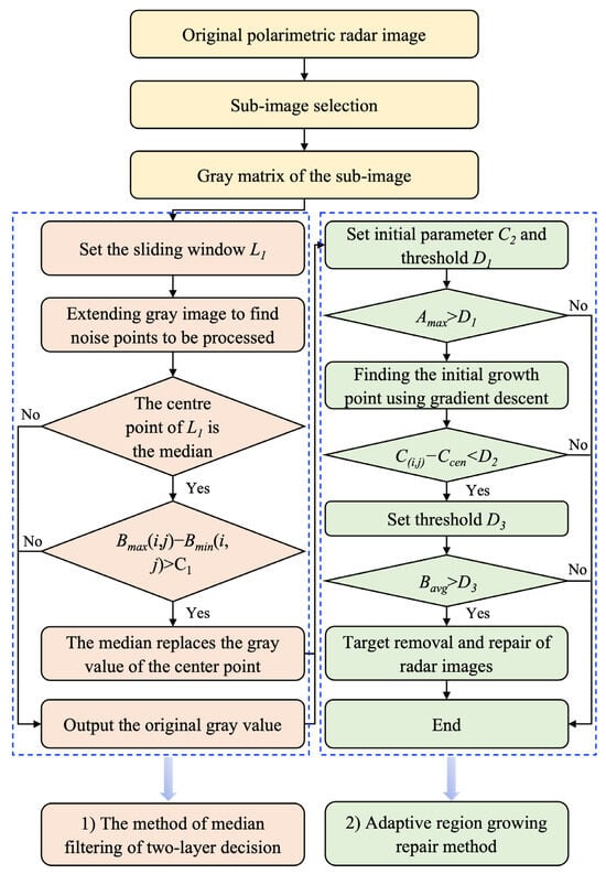 Targets on the sea surface can cause a lack of wave texture, leading to errors when estimating and from radar images using deep learning-based methods. To avoid this problem, this study uses an adaptive region-growing repair method to recover the image region disturbed by targets. The process is divided into four parts. The first part uses the adaptive threshold to determine whether the target is produced. The initial parameter is set with threshold , where is the maximum value in the grayscale value of all pixel points in . It is then determined whether is greater than , and if the output is based on the original grayscale value, the following calculation is required.