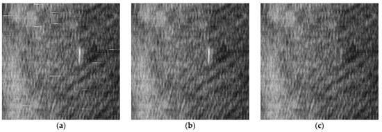 The fourth part is based on a mean-filling transition algorithm to restore the target and real wave recovery. The grayscale value of the pixel point where the target is located is set to 0. According to the size of the sliding window , is expanded to , and the mean value of the four-pixel points that are m points away from the centre of the noise point in the distance direction and orientation direction is selected to fill the image, instead of the noise point. Figure 3 shows the radar sub-image, processed radial noise line, and the image of the target object.