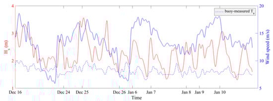 The X-band marine radar data used in this study were collected in Pingtan, Fujian Province, from 16 December 2010 to 10 January 2011. The detailed parameter information of the radar is shown in Table 2. The rotation period of the radar antenna was about 2.5 s, and a radar image sequence contained 32 images, that is, 80 s of each image sequence interval. The wave buoy that measured the reference data was deployed approximately 0.85 km from the radar. Since the references and were measured every 20 min, temporal interpolation is required to provide synchronized references for each radar image sequence. Figure 1 shows the position relationship between a radar image under polar coordinates and wave buoy placement. During data collection, was between 1.3 and 3.5 m and was between 6.5 and 10 s. At the same time, the synchronized local wind speeds ranged from 5.8 to 18.5 m/s, as shown in Figure 7, making the proposed method estimated under typical wind and wave conditions. The synchronized buoy references and radar images used in the study were not present at every moment, and the corresponding data are shown in Figure 7.