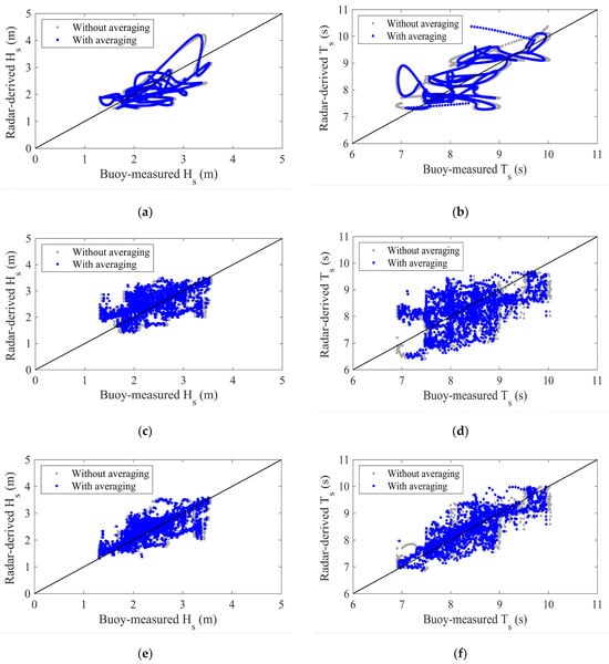 Scatter plots of the buoy-measured interpolated references and the radar-derived results. Blue and red dots correspond to HS and TS, respectively. (a,b) Testing results obtained from the SNR-based method. (c,d) Testing results obtained from the CNN-based method. (e,f) Testing results obtained from the proposed CNNSA-based method.