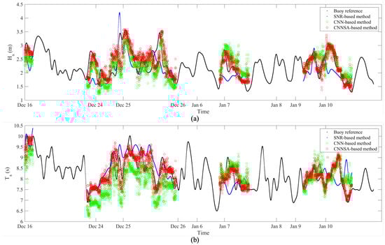 As can be seen from Figure 8a, when Hs is 2–3 m, the estimated result of is small, while when is greater than 3 m, the estimated result of is larger. In Figure 8b, the SNR-based estimation results show a large dispersion as a whole, which is due to the sensitivity of SNR-based methods to radar image noise, resulting in a large deviation in the estimation results. It can be seen from Figure 8c,e that the CNNSA-based method has a better linear correlation in estimation than the CNN-based method. Similarly, in Figure 8d,f, the CNNSA-based method also produces a better linear correlation in the estimation of . It can be seen from Table 3 and Table 4 that the correlation coefficients of and estimation based on the CNNSA method are 0.86 and 0.91, respectively, after the 30-min moving average, both of which are higher than those of the CNN-based method and SNR-based method. Further, Figure 9a and b, respectively, show the variation trend of and estimated by the three methods over time, and it can be seen that the results estimated by the CNNSA-based method are closer to the variation trend of buoy references.