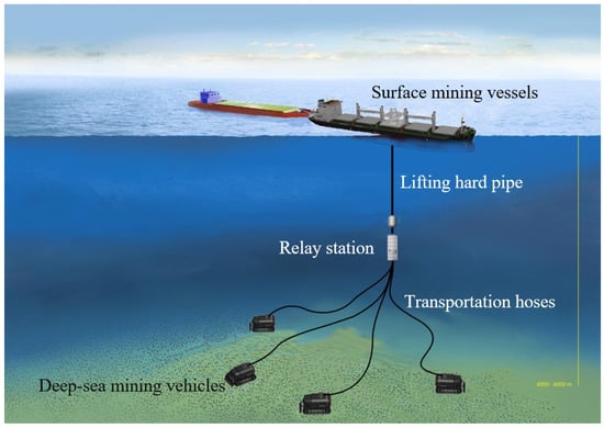 The main components of a deep-sea mining system include seabed mining vehicles [,,], transportation hoses, relay stations, lifting hard pipes [], and surface mining vessels [,,]. The complete system structure is shown in Figure 1. Seabed mining vehicles are used to collect mineral resources and preprocess; transport hoses are employed to transport preliminarily processed mineral resources from the mining vehicles to the relay station; mineral resources will be temporarily stored in the relay station, and when the storage volume reaches a predetermined level, the relay station transports the mineral resources to the surface mining vessel by lifting the hard pipe; the surface mining vessel is responsible for cleaning, classifying and storing the resources, and then transporting them to the land.