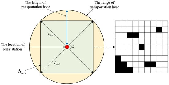 As mentioned in Section 1, the deep-sea mining vehicle is connected to the relay station through a transport hose, so the movement range of the mining vehicle is limited by the length of the hose. To cover as much of the deep-sea mining area as possible, we need to divide the larger complete mining area map into smaller sub-maps that are connected. To ensure the safety of the deep-sea mining system, the maximum distance between the deep-sea mining vehicle and the relay station must be less than the transport hose’s maximum length . With the above requirements, the range of action of the mining vehicle is a circle. However, if the circular motion range is directly used for map decomposition, there will be gaps between each circular sub-map, resulting in the omission of some seafloor mining areas that need to be covered. To ensure full coverage of the mining area and to facilitate the switching of mining vehicles between sub-maps, the map needs to be divided into rectangles. This requires finding the inscribed rectangle with the largest area  within the circular motion range of the mining vehicle. According to Equation (3):