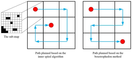 If the individual sub-maps are considered as a grid, from the result of the map decomposition, we can obtain a new grid map. Each grid in this map represents a sub-map of the mine. The study of the movement path strategy of the relay station is based on this grid map. Since the relay station is usually located in seawater and connected to the lifting hard pipe at a certain distance from the seabed, there are usually no obstacles or dangerous areas within the movement range of the relay station. In addition, the relay station also needs to stay in the center of the sub-map to ensure that the mining vehicle’s action range can cover the entire sub-map.