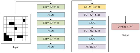 The neural network structure has also been modified and optimized to adapt to the requirements of the deep-sea mining mission. The path planning task needs to incorporate the current environmental information. The neural network first inputs the state matrix into the convolution layer to extract the mining area environmental information and mining vehicle position information and then uses the ReLU activation function to mine relevant features, fit the training data and accelerate the convergence of the neural network. We removed the common pooling layer in neural networks to retain all the information of the state matrix as much as possible and avoid losing effective environmental data during the pooling process. The algorithm also introduces a long- and short-term memory mechanism (LSTM) to correlate successive state matrix information and enhance the effectiveness of the neural network. After completing the above processing steps, the algorithm uses a fully connected layer to weight the previously obtained features and integrate the feature representation into a concrete numerical representation. The final output of the fully connected layer is the evaluation value of all actions in the action space. The specific structure of the neural network is shown in Figure 5 below.