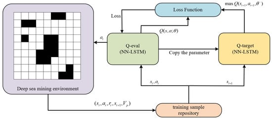 After the training samples are input into Q-target and Q-eval simultaneously, two different sets of results will be calculated. The algorithm uses the difference between these two data sets to calculate the neural network’s loss function. The loss function is used to update the parameters of the neural network for Q-eval, which determines the speed of convergence of the neural network. Based on the computation results of the two neural networks, the algorithm calculates the loss function and uses the obtained data to update the neural network parameters of Q-eval. In addition, the parameters of the two neural networks are synchronized at intervals. Different problems have different requirements for loss functions. Currently, commonly used loss functions include the mean absolute error function and the mean square error function. For the cluster-coverage path planning problem of deep-sea mining, the loss function we use combines the characteristics of the above two functions. The specific definition of the function is as follows: