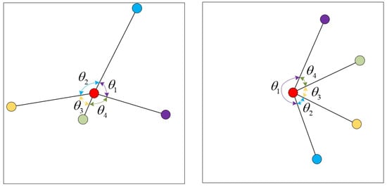 In the deep-sea mining system we designed, there are four deep-sea mining vehicles working together. Based on the current location information of the mining vehicle and the relay station, we can create a straight line connecting the mining vehicle and the relay station. This straight line can be approximated as a transport hose. There will be an included angle between every two adjacent straight lines, and four mining vehicles will produce four included angles, as shown in Figure 7. As long as these four included angles are greater than or equal to zero at any time, no matter how the position of the deep-sea mining vehicle changes, there will be no problem of hose entanglement.