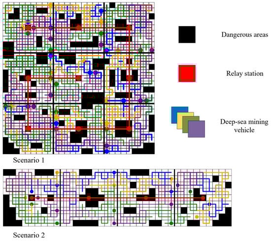 The main problem that needs to be solved in this study is the problem of hose entanglement between the deep-sea mining vehicle and the relay station. The deep-sea mining vehicle and the relay station are connected through hoses to realize mineral resource transportation, mining vehicle energy supply, and data communication. Due to the presence of hoses, collaborative operations among mining vehicles may result in hose entanglement, which poses a safety risk to the system. The introduction of angle-based constraints effectively eliminates the problem of hose entanglement between mining vehicles.