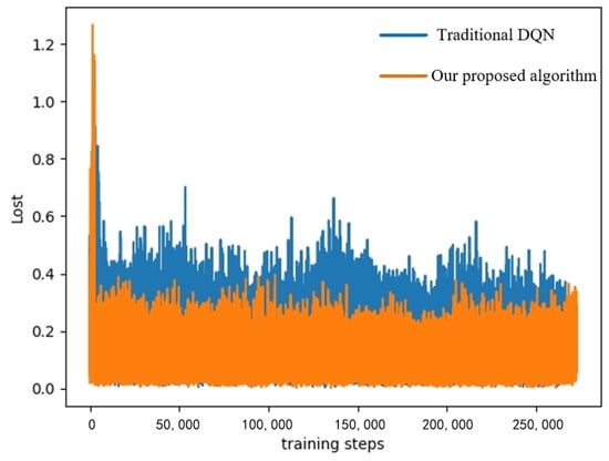 Comparison of the loss function between the algorithm proposed in this article and the traditional DQN algorithm.