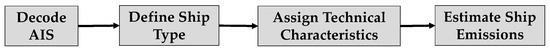 The first step comprises the decoding of AIS data, from the reading of the files containing AIS messages to the sorting of the necessary information. The second step defines the area of study, identifying ships that navigate through it. Those ships are then associated with their corresponding technical data, producing ship profiles, in the third step. Once the ship’s profile has been defined, instantaneous emission estimates can be calculated in the fourth step. In the fifth and final step, the results of instantaneous emissions are organized to obtain the total amount of emissions and the distributions along the voyage and on a geographical grid. The following sections address with more detail each of these different steps.