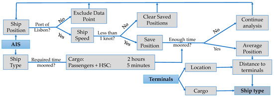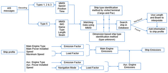 Figure 2 provides a more detailed description of the methodology, illustrating for example that AIS data are the main input of this methodology, with the dynamic information of types 1, 2 and 3 messages (ship’s speed, position and time) being matched with static information messages of type 5 (containing the IMO number, the ship’s name, its type, length overall and beam) with correspondent Maritime Mobile Service Identity (MMSI) numbers. This process generates a profile for the ship, describing both its operation and main characteristics. For cases where AIS does not properly identify the type of ship, an alternative method must be used, determining the type of ship based on the visited terminal or the vessel’s dimensions.