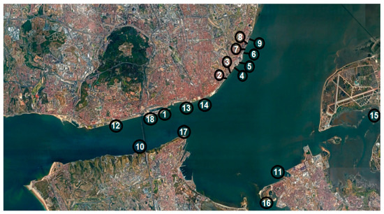 Studied terminals at the port of Lisbon. 1 container; 2 general cargo; 3 container; 4 general cargo; 5 container; 6 bulk; 7 general cargo; 8 general cargo; 9 general cargo; 10 bulk; 11 general cargo, 12–17 ferry; 18 cruise.