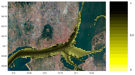The port of Lisbon spreads through the mouth of Tagus River, along both of its banks. It is of the utmost interest to assess the distribution of ship emissions throughout the port of Lisbon’s geographical domain, providing information on the most affected regions, as the port is located very close to densely populated areas. This was carried out by the tool SEA, presenting a grid distribution, with each cell representing an area of 222 by 174 m, estimating emissions of port traffic from 9 July to 9 August 2008. Before proceeding with the estimation of emissions, the fleet under study was divided per ship type, averaging each type’s technical characteristics, as shown in Table 10. An example of the resulting distribution is shown in Figure 6, in this case regarding the emissions of CO2. Due to the large difference in the order of magnitude from emissions with heavy and scarce emissions, the results were plotted as the logarithmic scale of the ratio to the maximum registered value (highest concentration of instantaneous emissions per cell registering 115 g, 55 g, 5645 g, 4.8 g, 4.1 g of NOX, SO2, CO2, HC and PM, respectively).