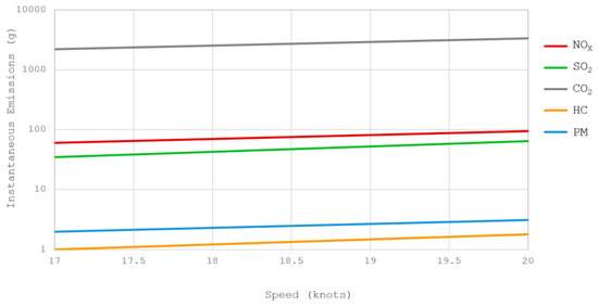 For a single ship operating in the cruising mode, the auxiliary engine’s operation remains constant and both the main engine’s installed power and emission factors also remain unaltered, with the only changed parameter being the main engine’s load factor, depending on the cube of the ship’s speed; therefore, there is a direct proportionality between the value of instantaneous emissions and the cube of the ship’s speed. Figure 7 presents a graphical display of this relation.
