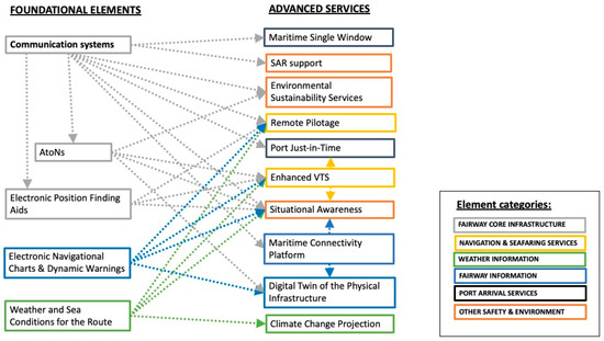 Secondly, the reliance of the 10 advanced services—(1) Maritime Single Window, (2) SAR Support, (3) Environmental Support Services, (4) Remote Pilotage, (5) Port Just-in-time, (6) Enhanced VTS, (7) Situational Awareness, (8) Maritime Connectivity Platform, (9) Digital Twin of the Physical Infrastructure, and (10) Climate Change Projection—on other elements, as depicted in Figure 1, underscores a complex web of dependencies. These services, being at the forefront of the Smart Fairway initiative, necessitate a solid foundation in basic foundational elements to function optimally. Their complexity and reliance on other components mean that their development is not only more challenging but also dependent on the maturity and robustness of the related services and foundational fairway elements.