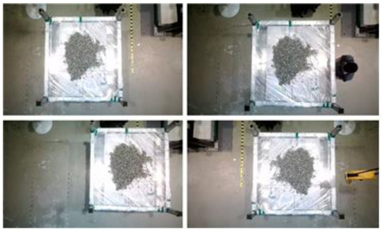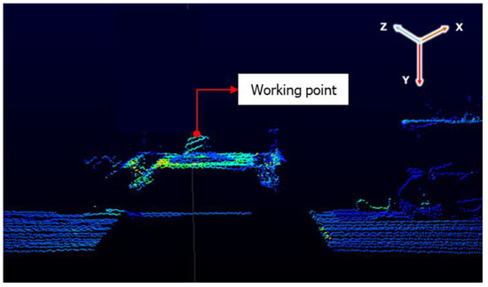 In addition to a cargo hold detection system, the creation of an operational point determination system for an automatic GTSU is a crucial undertaking in contemporary seaport operations. The Programmable Logic Controller (PLC) system calculates and manages the position of the trolley and grab for material loading and unloading. This ensures that the GTSU runs with maximum efficiency and accuracy. The system optimizes efficiency by automating the identification of the working location, reducing human error, accelerating the cargo transfer procedure, and improving overall production. By integrating cutting-edge technology like sensors and AI algorithms, this system can evaluate situations in real time and adapt the operations of the GTSU in dynamic contexts. A well-calibrated working point determination system is crucial for the smooth automation of the complete GTSU operation. Thus, in order to develop a functional point extraction model, the authors employed a LiDAR sensor to perform a scan of the material area. The data obtained from the LiDAR sensor consisted of point clouds, as depicted in Figure 14. A point cloud refers to a set of data points that exist in space. Point clouds are commonly utilized in computer graphics, computer vision, and geospatial sciences [24]. These points generally depict the outer surfaces of things, offering a three-dimensional representation. Point clouds, which are essential for creating digital 3D models of real-world settings or objects, are produced through the use of 3D scanners or photogrammetry tools that analyze aerial photos. Consequently, this can facilitate the provision of information regarding the state of materials in the ship’s hold.
