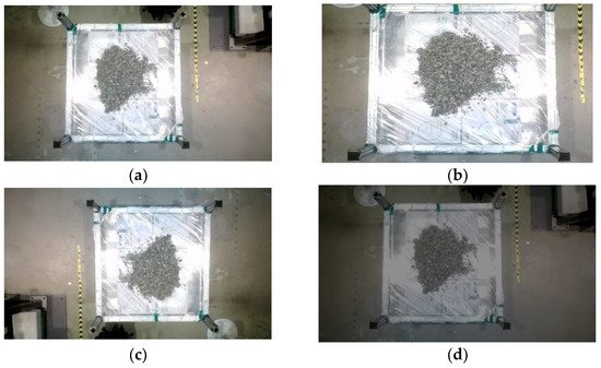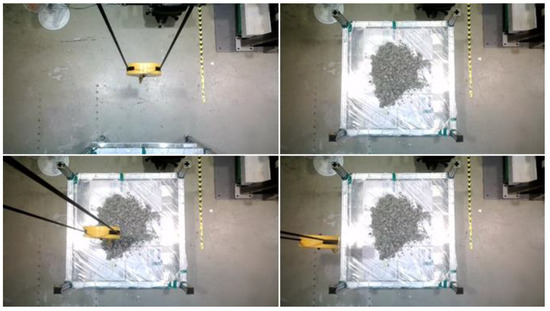 The authors evaluated the working point extraction model on the lab-scale GTSU system. The outcomes indicate that the model adeptly identifies the material area’s coordinate position and the working point, as shown in Figure 16. The LiDAR sensor was used to capture point cloud data, as depicted in Figure 16a. The goal was to ascertain the coordinates of the operational location inside the designated raw material region. Figure 16b presents a two-dimensional graphic that visually represents the material zone in a storage compartment. The image consists of paper boxes and stones placed in a way that simulates the distribution of materials. The designated operational location for the GTSU system is positioned at the highest point of a paper box. After applying the point extraction model, the coordinates of point clouds, material areas, and working points are separated and retrieved, as shown in Figure 16c. Figure 16d presents the coordinate data for the raw material region and working coordinates, which are obtained from the point cloud. The working point coordinate is the red point. Table 4 displays the coordinates of the working point obtained from the model, which were compared with measurements taken using a ruler. The error of this model is about 5–10% when compared with manual measurements.
