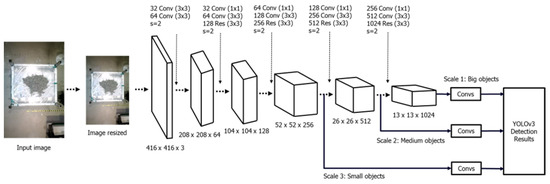 The YOLOv3 algorithm, a third version of the initial YOLO algorithm, introduced numerous improvements. Initially, it utilized the Darknet-53 architecture, which is a more complex neural network that led to enhanced feature extraction, thus enhancing accuracy [17]. Furthermore, YOLOv3 implemented three distinct detection scales, thereby mitigating one of the initial model’s limitations in recognizing smaller objects. The model accomplished this by employing three different sizes of anchor boxes at each detection scale, enhancing its ability to identify objects with different dimensions. In addition, YOLOv3 enhanced the class prediction method by utilizing separate logistic classifiers instead of relying on Softmax. This allows for the identification of several object categories within a single bounding box. The YOLOv3 algorithm has improved upon its predecessor by not only maintaining real-time detection capabilities, but also greatly increasing accuracy. As a result, it is now considered one of the most efficient object detection algorithms in the current AI field.