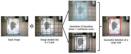 The YOLOv3 model’s architecture is illustrated in Figure 6, employing the Darknet-53 framework. The design comprises 53 convolutional layers, which enable enhanced feature extraction by using the integration of YOLOv2, Darknet-19, and ResNet. The primary elements of YOLOv3’s architecture consist of 1 × 1 and 3 × 3 convolution kernels accompanied by ResNet-inspired skip connections [18]. Figure 7 illustrates the primary steps of the YOLOv3 algorithm as it is used to detect cargo holds. The algorithm will partition the image into SxS grids. Every grid will forecast the positions of bounding boxes and the likelihood of different categories. Ultimately, the system generates a conclusive prediction to ascertain the cargo hold [19].
