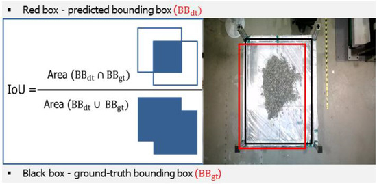 Intersection over Union (IOU) is a crucial metric in computer vision, specifically in object detection tasks, that is used to assess the accuracy of predictions. The Intersection over Union (IOU) metric measures the degree of overlap between the predicted bounding box and the ground truth bounding box. It provides valuable information on the accuracy of a model’s object detection by assessing how well the anticipated location coincides with the actual location of the object [19]. To calculate the IOU, the initial step involves determining the intersection area between the two bounding boxes. This value is then divided by the size of their union. The IOU value is mathematically derived using Equation (1).