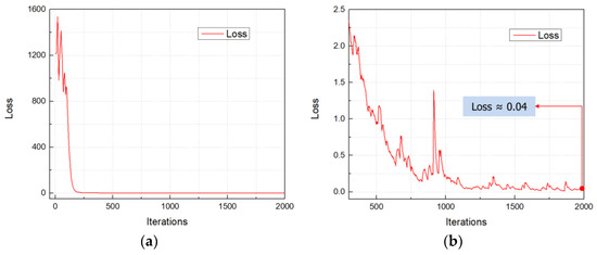 Loss functions: (a) loss curve after 2000 iterations; (b) loss curve from 300 iterations to 2000 iterations.
