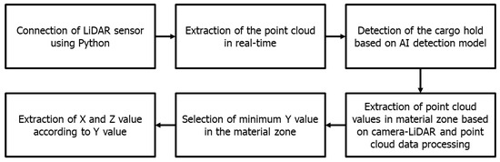 The working point extraction model was created by utilizing the cargo hold detection model, which relies on cameras and point cloud data obtained from LiDAR sensors. Initially, the authors employed Python to decipher the LiDAR sensor, enabling the extraction of point cloud data. By decoding the data, it becomes possible to provide ongoing updates on the condition of materials within the ship’s compartment using real-time point cloud data. After extracting the point cloud data, it is crucial to convert these point picture values into numerical values. Simultaneously, the authors utilized the cargo hold detection model to identify specific regions where materials were located, establishing criteria to isolate point cloud data that contain information about the material zone. The alignment of the LiDAR sensor and the camera is then calibrated. Using this calibration, the authors determine the condition of the material. The working point refers to the nearest point of proximity between the LiDAR sensor and the substance. Figure 15 illustrates the procedure for determining the operating point of the GTSU system.