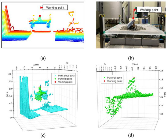 Results of extracting the coordinate of the working point: (a) point cloud data at the old position; (b) the coordinates of materials and the working point at the old position; (c) point cloud data for the new position; (d) coordinates of material zones and the working point for the new position.