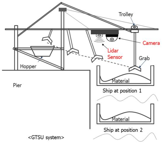 Yang et al. presented several technologies and obstacles involved in the automation of equipment at seaports in the context of creating intelligent ports [6]. For example, positioning and obstacle avoidance algorithms for automatic guided vehicles (AGV) were proposed by Pratama et al. [7], and analysis and evaluation of the motion of steel container cranes based on structural health monitoring was presented by Kaloop et al. [8]. To complete the process of building smart seaports, proposals for designing automatic GTSU systems for the transportation of raw commodities like coal or iron ore at seaports need to be researched and developed. The automated GTSU system provides secure functioning, providing financial advantages and diminishing carbon emissions as a result of their energy-efficient characteristics in contrast to conventional systems. This system should leverage cutting-edge sensor technologies, artificial intelligence, big data, and the Internet of Things. This integration aims to substitute human tasks with a sophisticated network of sensors and control systems. These automated components will meticulously monitor and manage the trolley’s movements and the grab’s functionality within the port environment. However, in order to build an effective automatic GTSU system, problems such as self-identification of the cargo hold, determination of the coordinates of the operating point, and provision of collision risk warning during operation must be solved.