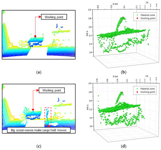 Figure 18 displays the extracted working point coordinates after shifting the lab-scale cargo hold from its initial position. Figure 18a,b present the point cloud data of the cargo hold at the starting position and the coordinates of the working point and material area, respectively. Nevertheless, in practical scenarios, the location of the cargo hold can be altered by substantial oceanic waves. The authors relocated the lab-scale cargo hold model to a different position, as shown by the data point cloud in Figure 18c. Once the products have been relocated, the point extraction model may still accurately determine the coordinates of the working point and the material area, as depicted in Figure 18d. The information about the x, y, and z coordinate values of the working point was extracted at the old position of the cargo hold and the new position of the cargo hold due to the impact of environmental factors, as described in Table 5.