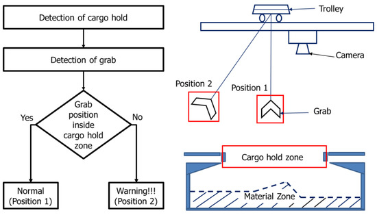 In the authors’ system, the AI solution self-identifies and provides information about working coordinates for grabs equipped with opening and closing mechanisms to load and unload goods based on material density in ship compartments. Additionally, the system continuously monitors the ship’s compartment position, offering information about material coordinates even if the ship’s compartment is moved from its original position. Therefore, the working point extraction model was implemented to automate the determination of working point coordinates within the cargo hold, streamlining the material loading and unloading processes for the automatic GTSU system.