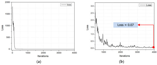 Loss functions: (a) loss curve after 4000 iterations; (b) loss curve from 500 iterations to 4000 iterations.