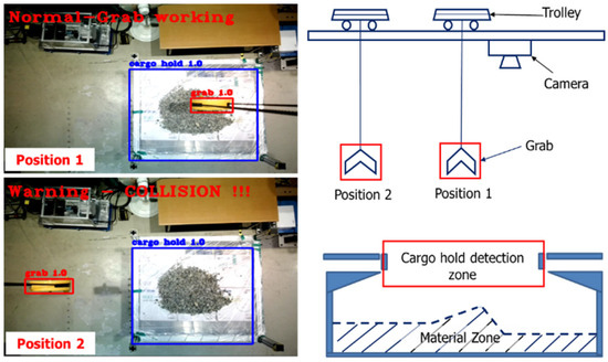 The anti-collision notification mechanism was utilized to identify collisions between the grab and the cargo hold in the lab-scale GTSU system. Real-time data generated by the camera were then processed by a central control unit. This unit employed algorithms to analyze incoming data, identifying potential collision risks and assessing spatial relationships between the cargo hold and grab. The efficiency of this processing is critical, directly impacting the system’s ability to provide timely warnings or take preventive actions. When a potential collision threat is detected, the anti-collision system engages in a series of actions aimed at avoiding or mitigating the impact. Figure 24 illustrates the model’s ability to accurately identify the location of both the grab and the cargo hold, detecting potential collision risks. The model monitors the location of the cargo hold and grab and then issues warnings based on predetermined criteria. If the grab position is located outside the working area during GTSU operation, the system triggers visual and auditory alerts to GTSU operators, providing crucial information for corrective actions. Alternatively, it can send signals to the control system to verify information and regulate the grab to a secure operational location. The goal is to ensure that equipment operates harmoniously, avoiding collisions that could result in damage to cargo and equipment or pose risks to personnel. Therefore, the significance of the anti-collision system in seaport cargo handling operations is paramount. Beyond preventing accidents, it enhances operational efficiency by facilitating the seamless flow of cargo. The system minimizes downtime due to collisions, reducing the risk of delays and ensuring goods are handled in a timely and secure manner. This efficiency leads to reduced costs and a general enhancement in the productivity of the port. Hence, this model will play a crucial role in advancing automated GTSU systems in the future.