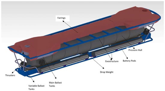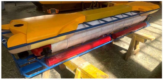 The main particulars of the tourist submarine are given in Table 1. Data from the towing tank, where the experiments are conducted, are shown in Table 2. The model was manufactured on a geometrical scale of 1:9, comprising various parts attached to the pressure hull, as presented in Figure 1. The hull was constructed from glass-reinforced plastic (GRP), cover parts were made from plywood and obeche wood, and the exostructure was made of steel. The battery pods were produced from tin, while the variable ballast tanks were made from plastic.