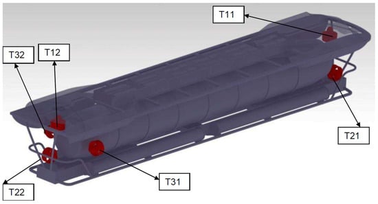 The positions of the thrusters on the submarine model: the main thrusters at the stern—T31 and T32; the side thrusters—T12 and T21; the vertical thrusters—T11 and T12.