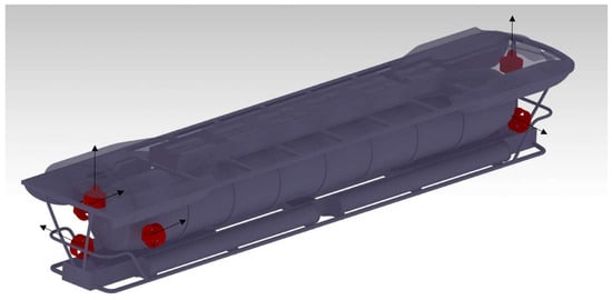 The submarine model was equipped with six thrusters to conduct the manoeuvrability tests, i.e., two main thrusters at the stern, two side thrusters, and two vertical thrusters, as seen in Figure 2. In this way, the model can manage any operative condition. In the tests, the vertical positions of the vertical thrusters were altered to determine the relation between the positions and the diving ability of the submarine.