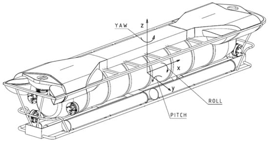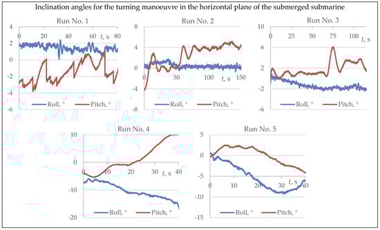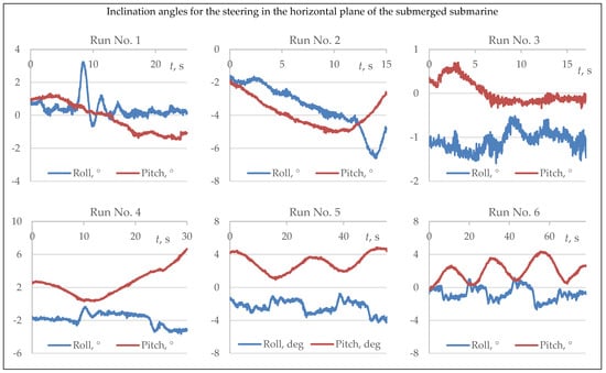 Figure 5 describes the reference coordinate system with the denotation of the positive orientation of angular motions, which is used during the test to monitor the submarine’s behaviour and inclination angles.