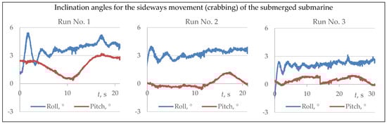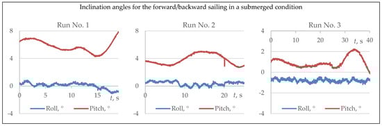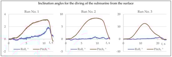 Overall, once the diving manoeuvre started, the differences in diving velocity with regard to the thrusters’ positions were insignificant. The roll angle was not pronounced for any tested conditions; i.e., the maximum measured value was below 2°. The values of the pitch angles were similar for the tested cases. At first, the pitch angle increases, and when the diving progresses, it returns to the initial value (zero value). For lover average diving velocities, the maximum pitch values were approximately 12°. The maximum pitch was reduced as the diving velocities increased, so for the maximum velocity, the pitch was up to 3°.