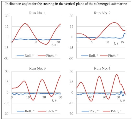 These manoeuvres were conducted by the main propulsive thrusters (T31 and T32) as well as the vertical thrusters (T11 and T12). The model maintained a straight course while manoeuvring in the vertical plane while the roll angles were below 5°. The pitch angles changed in a range from −15 to + 20°. The inclination angles were not too large, even at higher tested velocities, so the manoeuvres were performed stably.
